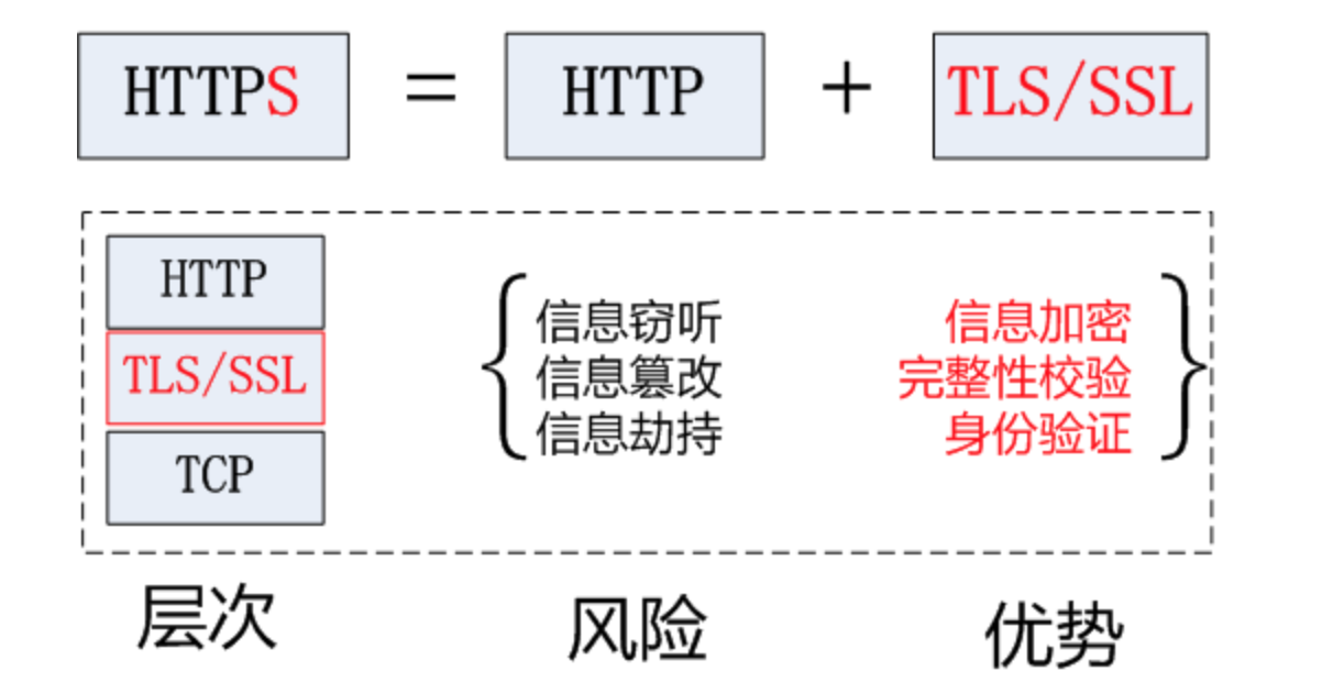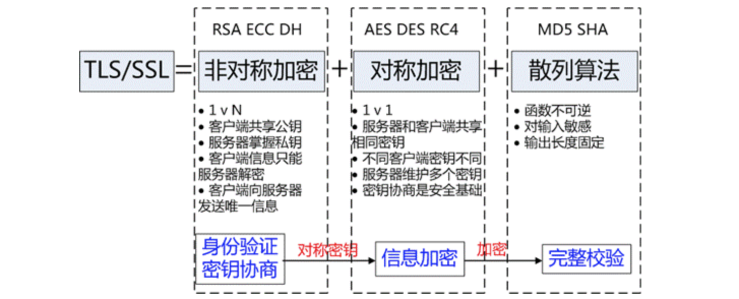 SSL/TLS 的功能实现主要依赖于三类基本算法:散列函数、Hash、对称加密和非对称加密,其利用非对称加密实实现身份认证和密钥协商,对称加密算法采用协商的密码对数据加密,基于散列函数验证信息的完整性。